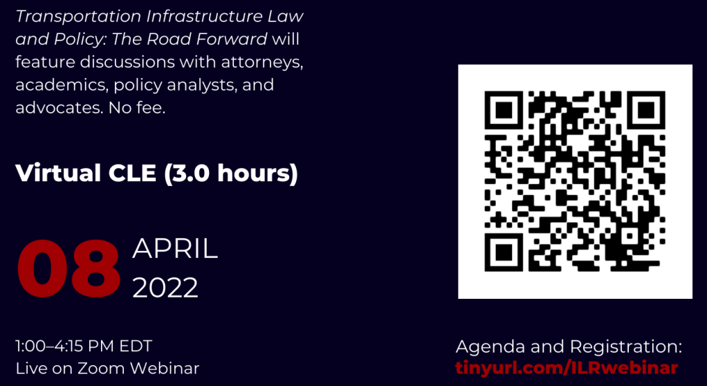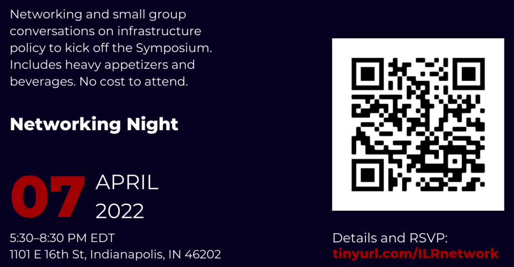 Transportation is at the heart of American life. Transportation infrastructure provides access, or lack thereof, to employment, resources, educational opportunities, housing, and more. The Indiana Law Review Symposium will include discussions from diverse scholars examining and even reimagining transportation infrastructure. It will take place on Friday, April 8, 2022, from 1:00–4:15 PM Eastern. There is no fee to register, and attorneys are eligible for 3.0 hours of Indiana Distance Continuing Legal Education credit.