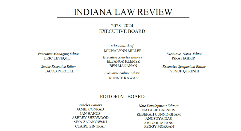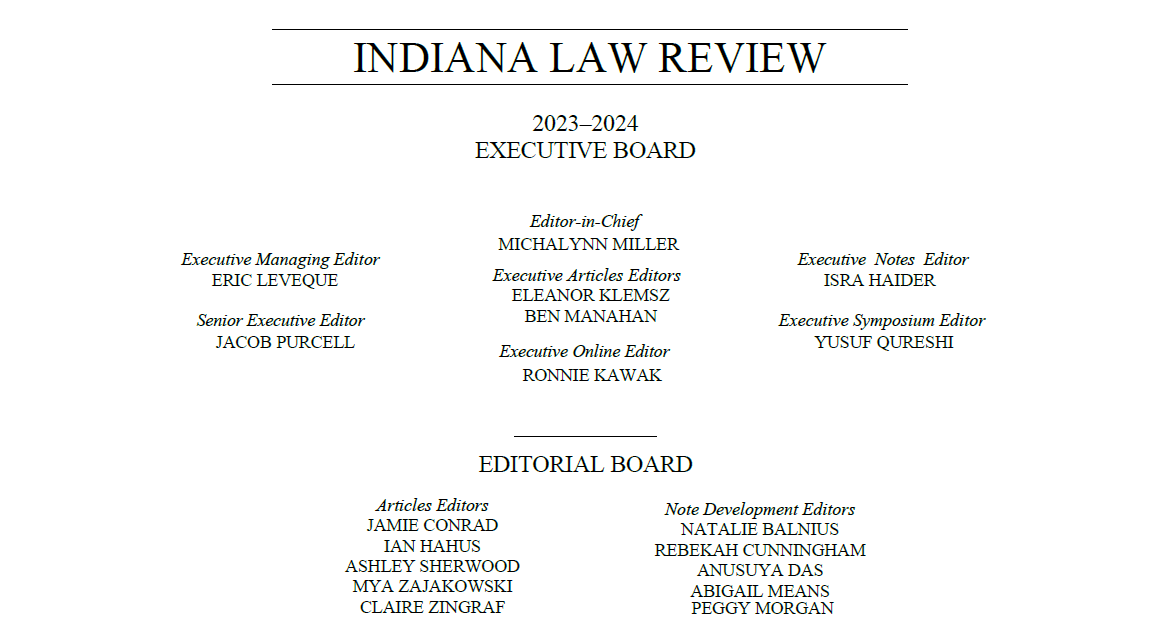 The Indiana Law Review is pleased to announce that the following members have been selected for our Volume 57 Executive and Editorial Boards. We look forward to their leadership and contributions to legal scholarship throughout the 2023–24 academic year.